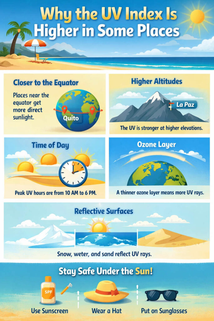 Have you ever checked the weather app and noticed the UV Index is much higher in one place than another ? You might wonder why the sun feels stronger at the beach than in your hometown. Let’s talk about it in a simple way.